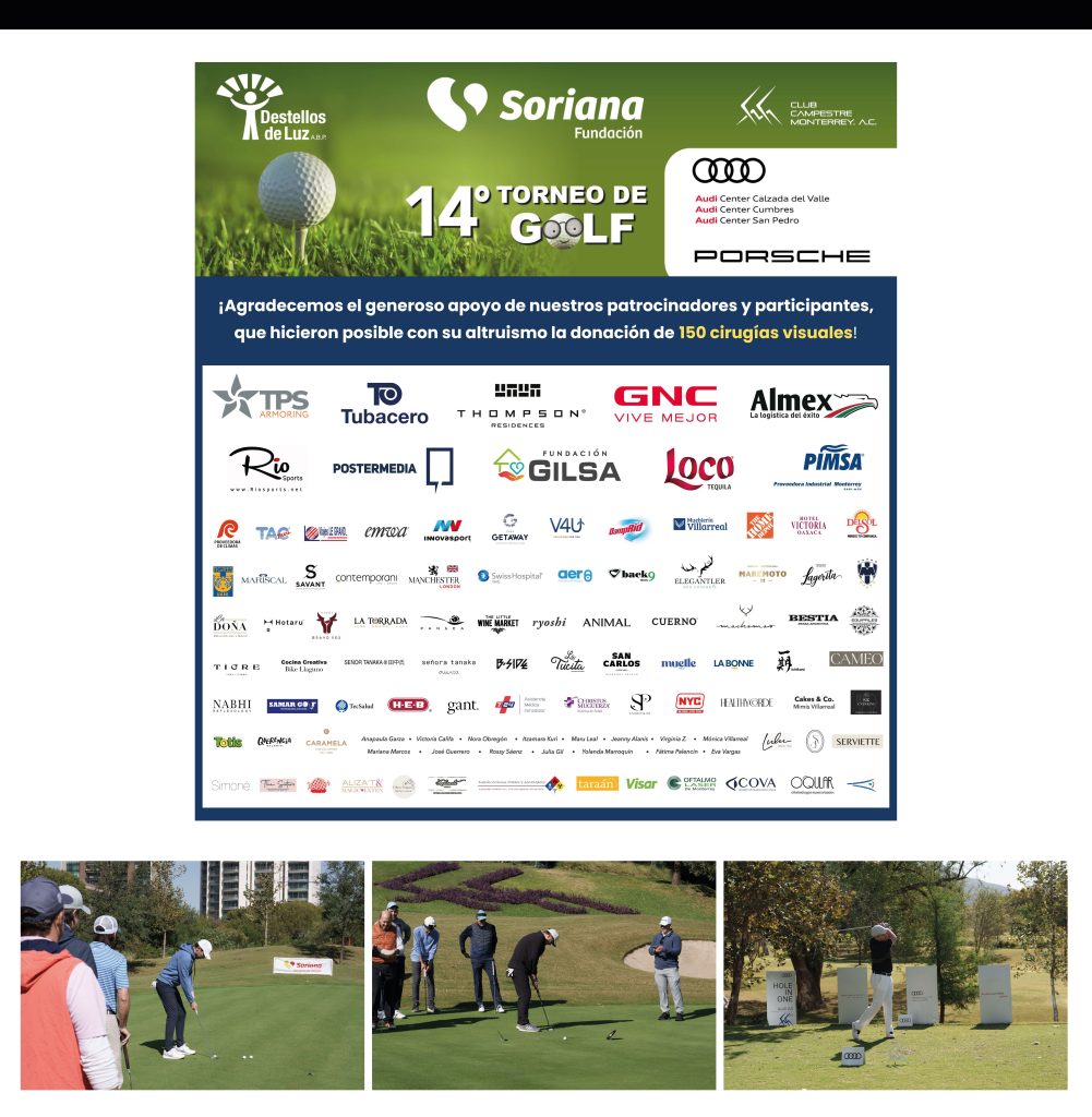 Agradecemos infinitamente a Soriana Fundación nuestro patrocinador oficial y a Audi Calzada del Valle y Porsche Calzada del Valle por su patrocinio con sus carros para los hoyos Hole-in-one.