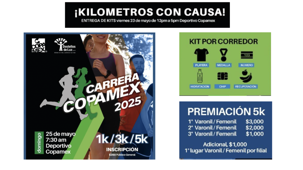 En Destellos de Luz queremos expresar nuestro profundo agradecimiento a CopaMex por organizar, un año más, la carrera Kilómetros con Causa. Su compromiso y generosidad han sido fundamentales para que esta noble iniciativa siga creciendo y transformando vidas.